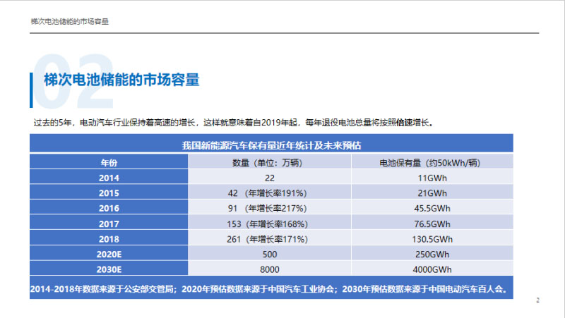 如果說梯次利用,我們先看一下梯次利用的市場容量,這是一個粗放的統(tǒng)計,電動汽車的統(tǒng)計來自于汽車工業(yè)協(xié)會和百人會。我們可以看到從2014年開始到2018年,因為2019年的數(shù)據(jù)還沒有統(tǒng)計出來。基本上電動汽車行業(yè)每年的增長率都接近200%,增長率最低的一年是168%,2017年查騙補。即使是對行業(yè)有沖擊,增長率依然保持在160%以上。電池保有量按照每輛車50度電估計,這個與真實的有些出入,早期以大巴車為主。梯次利用的好處是市場的物料來源基本上不需要預測,只需要看五、六年前的電動汽車數(shù)據(jù)就是非常精準的。因此我們可以得到的結論是,大量的退役電池以每年倍增的模式向市場上堆積。