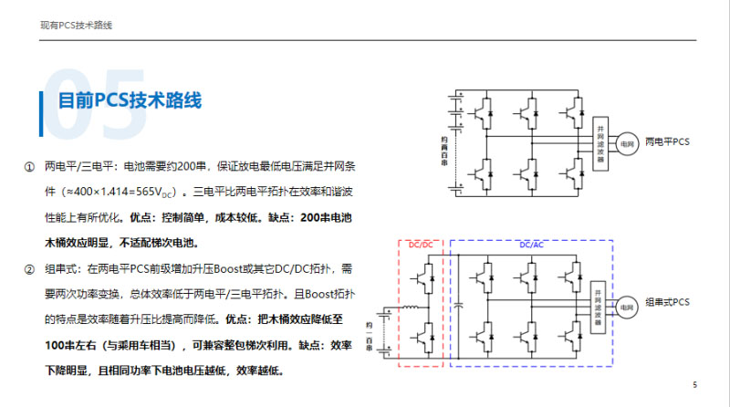 我們再來看一下作為核心設備的PCS目前發(fā)展到什么階段?目前市場上主流的PCS都是兩電平和三電平,三電平分為MPC和TMPC型的,他們的技術瓶頸、電池串聯(lián)數(shù)量比較大,滿足380伏的工業(yè)電網(wǎng)條件,直流測電價高于540伏,這是放電的最低電價,額定電價選擇在650伏,需要200多支的串聯(lián)。當然優(yōu)點是成本比較低、控制比較簡單。第二種方案是很多企業(yè)做的組串式,核心是DC/DC升壓,是一個兩電平,前端是整包利用的梯次電池,串聯(lián)在100串左右,優(yōu)點是木桶效應200支減到100支,雖然沒有根本解決問題,畢竟得到了減緩。另外可以兼容整包的梯次利用,缺點是它經(jīng)歷了兩次的功率變換,效率通常比較低。儲能和光伏一樣是效率高度敏感型的行業(yè),我們考核儲能的效率是考慮充放電效率,一充一放效率只有94%的話,一充一放的平放只有88%。
