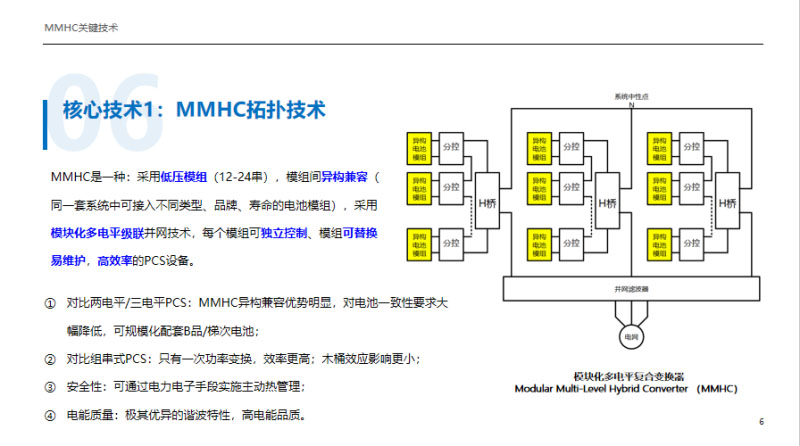 清華團隊經(jīng)過七年的研發(fā),我們提出三個關鍵的核心技術,第一個就是MMHC的拓撲技術,MMHC是采用低壓模組,通常是12到24串,模組間完全異構兼容。采用多電平級聯(lián)并網(wǎng)技術的PCS,可以實現(xiàn)模組的獨立控制、模組間的任意替換,并且保持非常高的效率,基本上在97%以上。同時同一套設備可以兼容不同廠家、不同品牌、不同類型、不同壽命的電池。