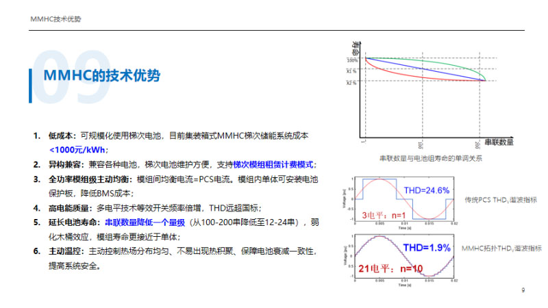 對比兩電平、電平PCS,MMHC異構兼容優(yōu)勢明顯,對電池一致性要求大幅降低,可規(guī)模配套B品、梯次電池。對比組串式PCS只有一次功率變換,效率有明顯的提高,木桶效應非常弱??梢酝ㄟ^電力電子手段實施主動熱管理,保持電網(wǎng)最喜歡的極高的電能品質。