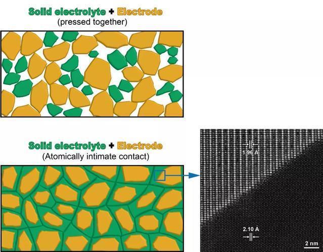 相比于通常使用的冷壓方法,新方案可以在原子尺度實(shí)現(xiàn)固態(tài)電解質(zhì)和電極的充分、緊密接觸。圖中原子分辨率的電子顯微鏡照片直接證實(shí)了這一緊密接觸。 中國科大供圖