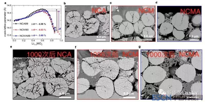 而XRD數(shù)據(jù)則揭示了NCMA材料結(jié)構(gòu)穩(wěn)定性的原因,隨著Li的脫出,層狀晶體結(jié)構(gòu)中的a值開(kāi)始下降(2.1-2.2%),c值開(kāi)始明顯增加達(dá)到4%左右,我們從下圖a能夠看到對(duì)于NCM和NCA材料而言脫Li過(guò)程中的c值的膨脹都達(dá)到了4%以上,而NCMA材料c值的膨脹僅為3.6%左右,從而減少了材料在充放電過(guò)程中的體積膨脹,抑制了顆粒內(nèi)部裂紋的產(chǎn)生和生長(zhǎng)。從下圖顆粒的界面圖我們也能夠看到NCA材料在脫Li和循環(huán)過(guò)程中二次顆粒內(nèi)部產(chǎn)生的裂紋是最嚴(yán)重的,這也導(dǎo)致NCA材料在循環(huán)中衰降速度較快。其次是NCM材料在深度脫Li和長(zhǎng)期循環(huán)中二次顆粒內(nèi)部也產(chǎn)生了大量的裂紋,而NCMA材料在深度脫Li和長(zhǎng)期循環(huán)中都表現(xiàn)出了非常優(yōu)異的結(jié)構(gòu)穩(wěn)定性,二次顆粒內(nèi)部的裂紋要明顯少于NCA和NCM材料。