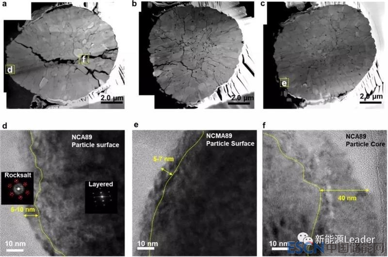 循環(huán)過(guò)程中二次顆粒產(chǎn)生的裂紋會(huì)引起電解液沿著裂紋侵入到二次顆粒的內(nèi)部,對(duì)二次顆粒產(chǎn)生更為嚴(yán)重的侵蝕,生成NiO類(lèi)似相。從下面的二次顆粒截面圖上我們能夠看到NCA材料在循環(huán)后二次顆粒內(nèi)產(chǎn)生了嚴(yán)重的裂紋,貫穿整個(gè)顆粒,而NCM材料雖然也產(chǎn)生了大量的裂紋,但是裂紋的嚴(yán)重程度較輕,因此二次顆粒還保持完整,而NCMA材料的顆粒內(nèi)部沒(méi)有出現(xiàn)明顯的裂紋。而從透射電鏡上我們能夠進(jìn)一步觀察到這些裂紋的影響,三種顆粒的表面結(jié)構(gòu)衰變層的厚度基本都在5-10nm,三者比較接近,但是在顆粒內(nèi)的裂紋處,NCA材料的結(jié)構(gòu)衰變層厚度達(dá)到40nm,而NCM材料為25nm,表明沿著裂縫進(jìn)入到二次顆粒內(nèi)部的電解液會(huì)對(duì)材料的結(jié)構(gòu)產(chǎn)生更為嚴(yán)重的破壞,從而導(dǎo)致材料的電荷交換阻抗的增加和倍率性能的下降。