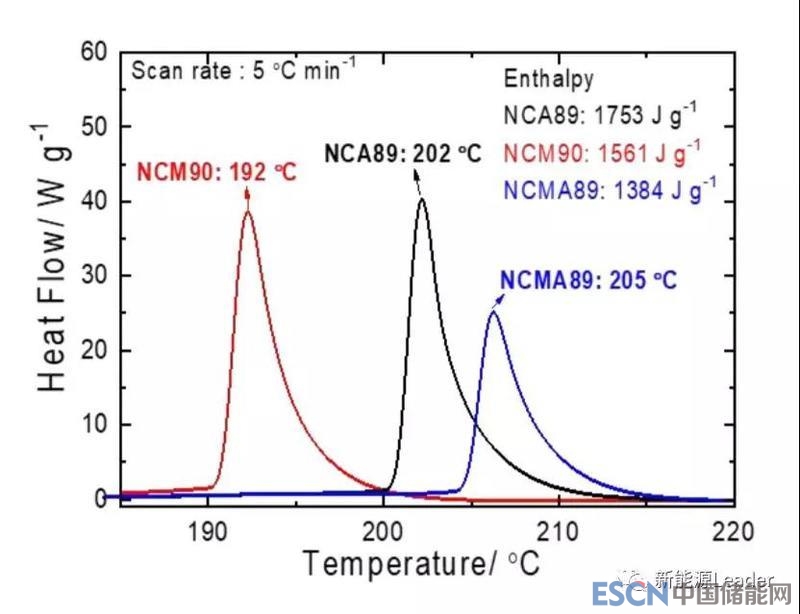 熱穩(wěn)定性也是一款材料在應(yīng)用中的關(guān)鍵因素,DSC測(cè)量表明NCM材料的熱穩(wěn)定最差,192℃就開(kāi)始放熱,產(chǎn)熱量為1561J/g,其次為NCA材料在202℃開(kāi)始產(chǎn)熱,產(chǎn)熱量為1753J/g,NCMA材料的熱穩(wěn)定性最好,205℃開(kāi)始產(chǎn)熱,產(chǎn)熱量為1384J/g。