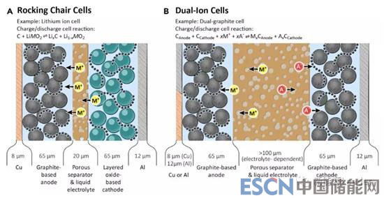 雙離子電池之所以叫雙離子電池,是因為在雙離子電池體系中參與電化學反應的并不是單一離子,我們知道在鋰離子電池中在正負極之間穿梭的只有Li+一種離子,電解液中的陰離子(如PF6-)并不參與反應。而在雙離子電池中則不然,不但陽離子能夠發(fā)生嵌入反應,電解液中的陰離子也能夠發(fā)生嵌入反應。