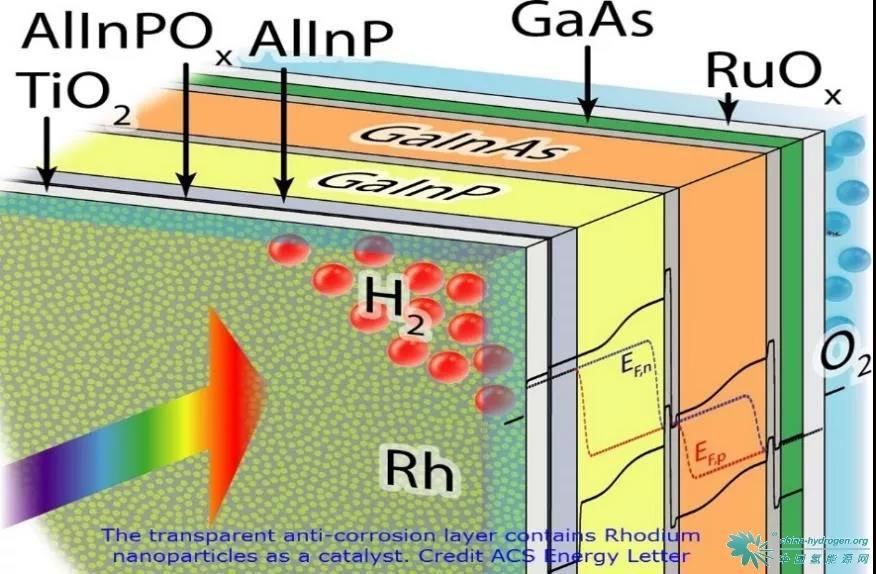 此次研究的重點也是單片光電陰極,研究團(tuán)隊將額外的功能層與III-V半導(dǎo)體制成的高效串聯(lián)電池相結(jié)合,能夠顯著降低電池的表面反射率,從而避免由光吸收和反射引起的能量損失。該研究團(tuán)隊在2015年已經(jīng)實現(xiàn)了超過14%的效率,如今采用結(jié)晶二氧化鈦層取代了防腐頂層,不僅具有優(yōu)異的抗反射性能,而且可以直接將催化劑顆粒附著在其表面。此外,科研人員還使用了一種新的電化學(xué)方法來生產(chǎn)銠納米顆粒催化劑,用于催化水分解反應(yīng),顆粒的直徑僅為10納米,光學(xué)上幾乎是透明的,因此非常適合光解水反應(yīng)。