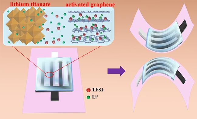 最近,該研究團(tuán)隊(duì)在國際上率先開發(fā)出一種新概念的全固態(tài)柔性平面鋰離子微型電容器。該微型電容器以高導(dǎo)電石墨烯為集流體,以高電壓離子凝膠作為電解質(zhì),以納米鈦酸鋰為負(fù)極和活化石墨烯為正極構(gòu)筑出高離子電子傳導(dǎo)的平面交叉指型微電極,進(jìn)而在一個(gè)基底上組裝出全固態(tài)鋰離子微型電容器。該鋰離子微型電容器具有高能量密度53.5mWh/cm3,高于目前報(bào)道的鋰薄膜電池和微型超級電容器。同時(shí),該鋰離子微型電容器具有優(yōu)異的循環(huán)穩(wěn)定性,6000次循環(huán)后電容保持率為98.9%;具有高溫電化學(xué)穩(wěn)定性,能在80°C條件下穩(wěn)定工作;以及具有優(yōu)異的機(jī)械柔性,在各種彎曲和扭曲狀態(tài)下達(dá)到性能基本沒有衰減。此外,該鋰離子微型電容器表現(xiàn)出良好的模塊化集成能力,無需金屬連接體,可有效調(diào)控輸出的工作電壓和容量。因此,該工作為開發(fā)柔性化、小型化、智能化儲(chǔ)能器件提供了新的策略。