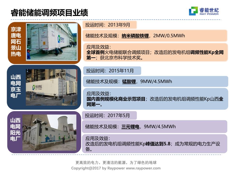 睿能2011年成立提出這個(gè)業(yè)務(wù)的構(gòu)想,在2013年有第一個(gè)項(xiàng)目落地,這也是全國(guó)第一個(gè)儲(chǔ)能火電聯(lián)合調(diào)頻的項(xiàng)目。這個(gè)項(xiàng)目在北京石景山熱電,用2MW/0.5MWh的儲(chǔ)能,配一個(gè)22萬(wàn)的機(jī)組。當(dāng)時(shí)我們用的系統(tǒng)是美國(guó)A123公司納米磷酸鐵鋰電池。這個(gè)項(xiàng)目是比較成功的示范項(xiàng)目,當(dāng)時(shí)我們做出來之后,這臺(tái)機(jī)組加了儲(chǔ)能之后,調(diào)頻性能能夠做到京津唐電網(wǎng)第一名。