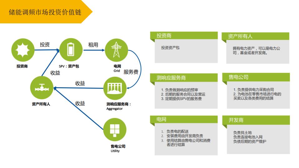 儲(chǔ)能在英國(guó)項(xiàng)目上投資的價(jià)值鏈跟大家也分享一下,因?yàn)槟壳吧轿鞯膸讉€(gè)調(diào)頻電廠,就是由火電廠和電網(wǎng)公司直接交易,在這個(gè)環(huán)節(jié)上偏單薄一點(diǎn)。我們?cè)谟?guó)有兩個(gè)角色非常關(guān)鍵。資產(chǎn)所有人就是我們的電站,電站直接跟電網(wǎng)公司交易,這是不被允許的。交易的時(shí)候是需要有兩個(gè)資質(zhì)的,拿不到這個(gè)資質(zhì)是沒有資格跟電網(wǎng)公司交易的。為什么這么設(shè)置?英國(guó)本身算是一個(gè)固網(wǎng)的電網(wǎng),因?yàn)樗且粋€(gè)島嶼,就設(shè)置了資產(chǎn)包的角色。另外還有一個(gè)關(guān)鍵的角色售電公司,咱們中國(guó)的售電已經(jīng)也有兩年的發(fā)展了,發(fā)展得也很迅速。儲(chǔ)能和售電怎么結(jié)合來參與電網(wǎng)的服務(wù)?在英國(guó)也是這樣去操作的。