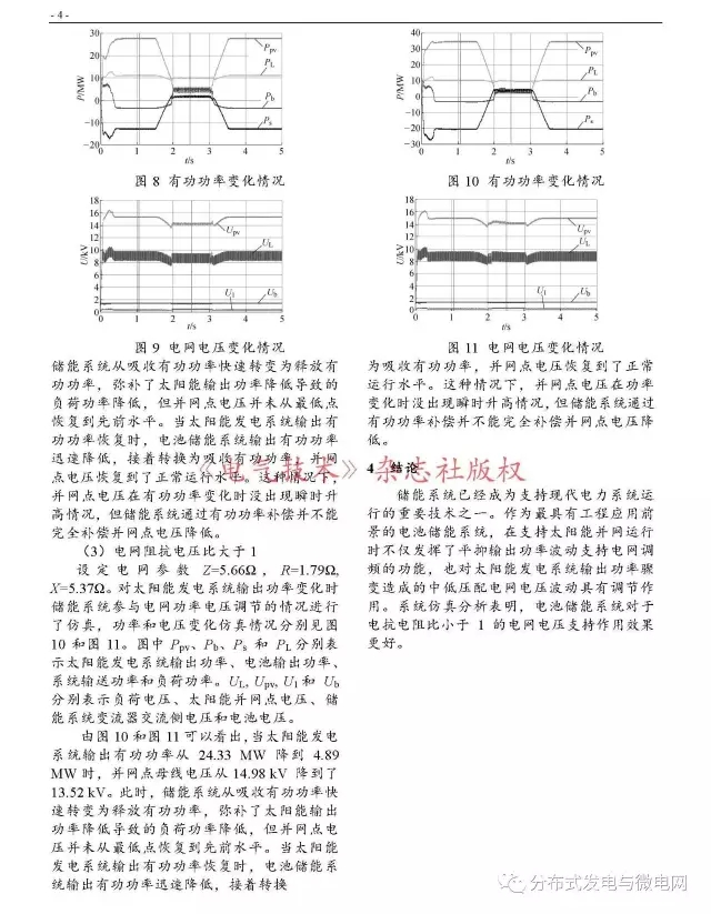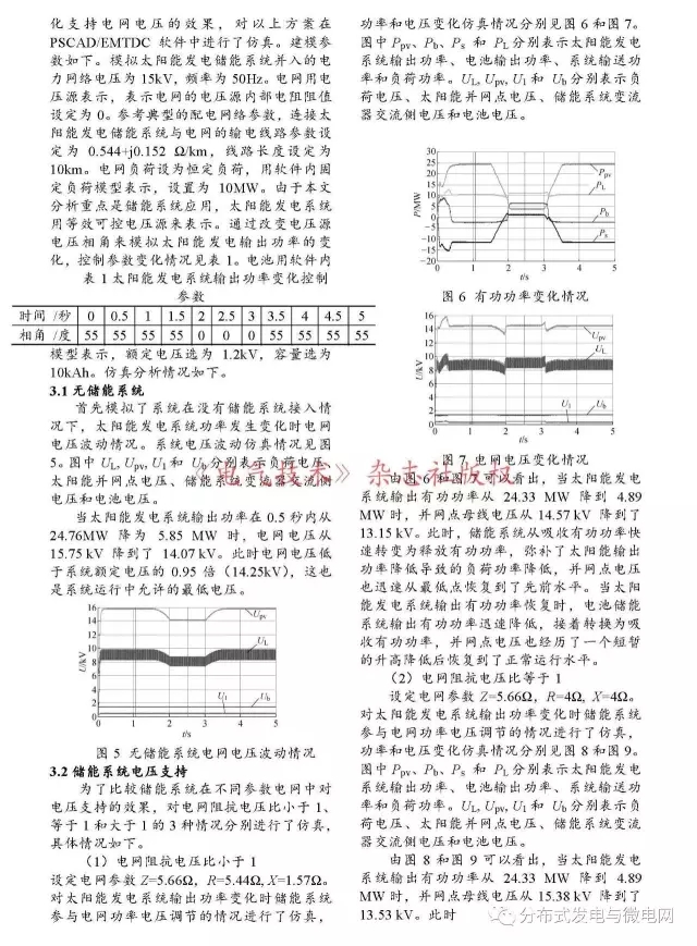 針對(duì)太陽(yáng)能發(fā)電系統(tǒng)輸出功率驟變引起的電網(wǎng)電壓波動(dòng)問(wèn)題,設(shè)計(jì)了利用電池儲(chǔ)能系統(tǒng)來(lái)補(bǔ)償快速變化的有功功率的方案來(lái)實(shí)現(xiàn)對(duì)電網(wǎng)電壓的調(diào)節(jié)。對(duì)儲(chǔ)能系統(tǒng)在不同電抗電阻比的三種電網(wǎng)參數(shù)情況下的電壓調(diào)節(jié)功能進(jìn)行了仿真分析。