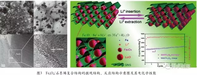綜上,我們?cè)谑?fù)合電化學(xué)儲(chǔ)能材料方面開展了較為系統(tǒng)的研究,得到了國(guó)內(nèi)外同行的廣泛關(guān)注,相關(guān)論文已被引用超過(guò)3 100次,并應(yīng)邀撰寫綜述論文3篇。特別是較早地開展了Co3O4和Fe3O4與石墨烯復(fù)合作為高性能電極材料的研究,并且給出了相應(yīng)的結(jié)構(gòu)模型(如圖3 所示),提出了石墨烯與氧化物復(fù)合是石墨烯在儲(chǔ)能器件中應(yīng)用的一個(gè)重要發(fā)展方向,因此獲得了廣泛關(guān)注,這兩篇論文已被引用1 200余次。