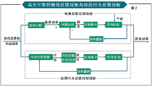 圖2中,物理反饋控制回路為純物理裝置的控制(可能包括必要的人工干預),通過比較發(fā)電機組實際發(fā)電功率與分配得的基準功率之間的偏差,產生控制信號作用于控制器,并控制發(fā)電機組功率,響應時間為秒級到分鐘級,響應精確、靈敏、迅速。經濟行為反饋控制回路主要是市場價格調整機制根據(jù)發(fā)電機組實際發(fā)電功率及其他信息獲得價格調整信號,市場主體基于價格信號作出行為響應,并通過物理控制器調整發(fā)電機組功率,由于此類反饋控制包括人的經濟行為,具有不精確、不靈敏、反應遲緩的特點。但在電力市場經典理論中,兩類反饋控制長期被混為一談。