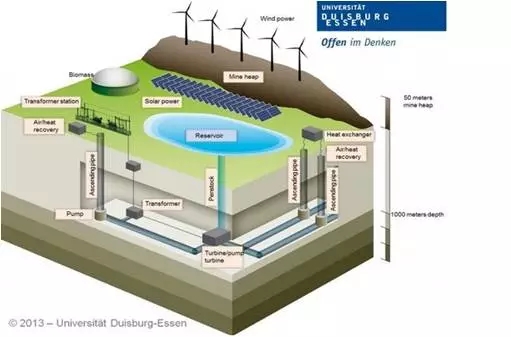 其中抽水蓄能項(xiàng)目規(guī)模200MW,參與方包括煤礦運(yùn)營商RAG AG,采煤服務(wù)提供商DMT以及University of Duisberg-Essen。該項(xiàng)目利用26千米的礦井的一部分來儲存一百萬立方米的水,建設(shè)抽水蓄能電站,以儲存附近多余的光能和風(fēng)能。到2018年,德國將關(guān)閉許多煤礦,意味著將煤礦改造為抽水蓄能電站的項(xiàng)目將越來越多,且能夠做到經(jīng)濟(jì)可行。
