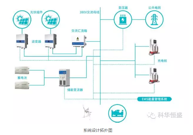 為改善秀峰充電站的用電環(huán)境及電網(wǎng)調(diào)節(jié),科華恒盛通過(guò)現(xiàn)場(chǎng)調(diào)研與技術(shù)開(kāi)發(fā),提出一套創(chuàng)新性的光儲(chǔ)充系統(tǒng)整體解決方案。即在充電站的基礎(chǔ)上增加光伏發(fā)電、儲(chǔ)能系統(tǒng)、應(yīng)急充電等系統(tǒng)進(jìn)行電網(wǎng)智能互動(dòng)。一方面,利用儲(chǔ)能系統(tǒng),全方位護(hù)航充電站的用電安全,避免快充對(duì)電網(wǎng)造成沖擊;另一方面,通過(guò)綠色電源供應(yīng)補(bǔ)充、削峰填谷等方式,為新能源電動(dòng)公交大巴提供更為高效且經(jīng)濟(jì)的電能。