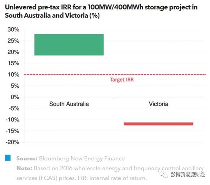 根據(jù)2016年的能源批發(fā)價和頻率控制輔助服務(wù)價(FCAS),南澳州電池項目的非杠桿內(nèi)部收益率可達(dá)18%-29%。然而,能源批發(fā)價和輔助服務(wù)價格走勢尚不明朗。如果南澳州效仿鄰近的維多利亞州投建新電廠和大量能源儲備系統(tǒng),或者建立額外的輸電線路,那么就會壓低這一電池系統(tǒng)的價格,而該項目就會面臨虧損。