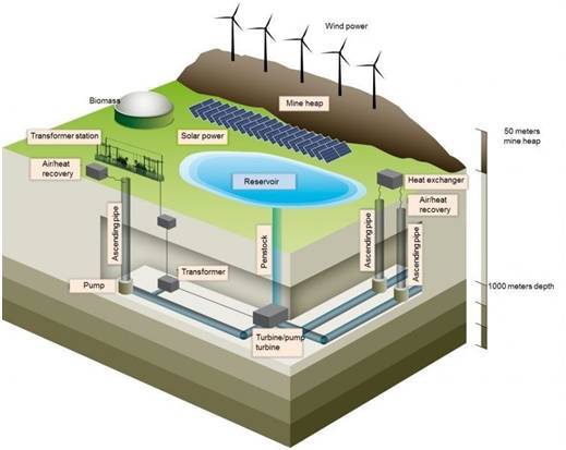對(duì)于Prosper-Haniel工廠(chǎng)的情況,下層水庫(kù)將由長(zhǎng)約16英里(25000米)深達(dá)4000英尺(1200米)的礦井組成。該站的200兆瓦水力發(fā)電將適應(yīng)生物質(zhì)能、太陽(yáng)能和風(fēng)力發(fā)電的組合。這并不是什么永動(dòng)機(jī),而是儲(chǔ)存在表層中的水將作為備用“電池”,在其他能源短缺時(shí),來(lái)填補(bǔ)供電的空白。
