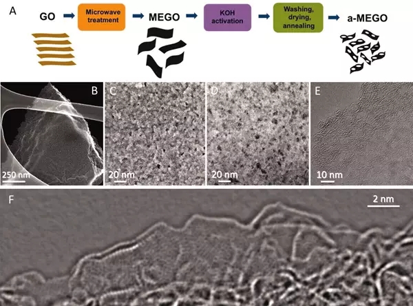 超級電容器在廣泛使用的過程中由于其低能量密度和相對較高的有效的串聯(lián)電阻而受到限制,使用電化學(xué)活化方法來剝離石墨烯,研究者們合成了一種比表面積高達3100m2/g的多孔碳,這種材料具有高的導(dǎo)電率和低的氧氫含量,靠sp2鍵結(jié)合的碳具有連續(xù)且高度彎曲的三維網(wǎng)狀結(jié)構(gòu),原子層墻最初的形成厚度為0.6-5納米寬度的孔隙,使用這種碳材料組裝的兩電極超級電容器有著高的質(zhì)量電容和高能量密度,而且文章中的方法甚至可以發(fā)展到產(chǎn)業(yè)化中。