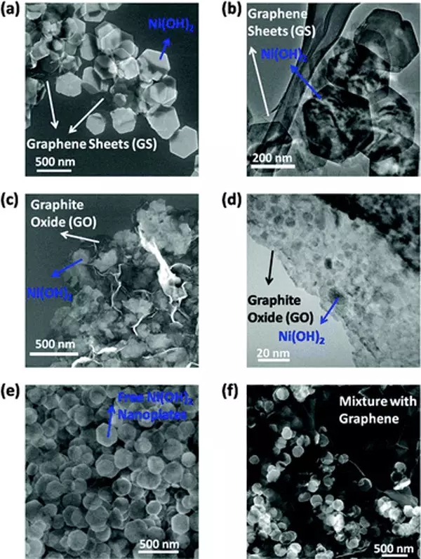 Ni(OH)2納米晶體上生長不同氧化程度的石墨烯片層作為電化學(xué)贗電容材料是一種十分有潛力的儲能應(yīng)用材料。單晶Ni(OH)2六邊形納米片直接生長在輕度氧化、表面導(dǎo)電的石墨烯片層上,復(fù)合材料顯示出高的比電容約為1335F/g和優(yōu)異的循環(huán)性能。高的比電容和快速的充放電能力很有前途應(yīng)用于能量密度和功率密度超高的超級電容器。預(yù)制備Ni(OH)2六邊形納米片和石墨烯進行一個簡單的物理混合顯示出較低的比電容,凸顯出直接在石墨烯納米材料的重要性,賦予了活性納米材料和導(dǎo)電石墨烯網(wǎng)絡(luò)之間緊密的相互作用和有效電荷傳輸。單晶Ni(OH)2六邊形納米片直接生長在石墨烯片層上的性能要優(yōu)于在小的Ni(OH)2納米顆粒上生長高度氧化的、電絕緣的網(wǎng)狀石墨烯。