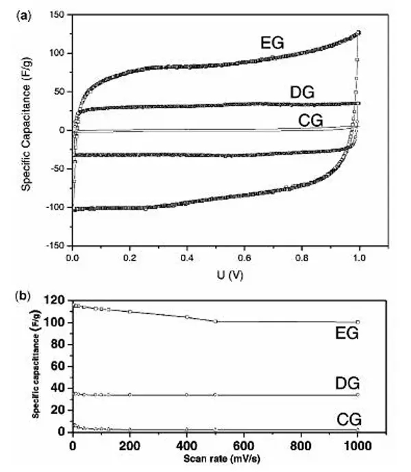 2008年,Vivekchand等人首次將石墨烯作為超級電容器電極材料。文章介紹了由三種不同的方法制備石墨烯作為電化學(xué)超級電容器的電極材料。制備的石墨烯比表面為925 m2/g,在1.0 mol/L H2SO4中,其比容量為117 F/g,當(dāng)以電壓窗口較寬離子液體N-甲基丁基吡咯烷二(三氟甲基磺酰)亞胺鹽(PYR14TFS)為電解質(zhì)時,其比容量和能量密度分別為71 F/g和31.9 Wh/kg。