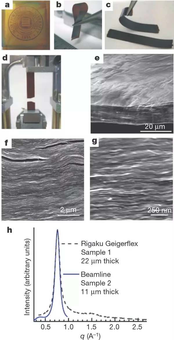 自支撐的紙型和薄膜型材料已經(jīng)是當(dāng)今社會技術(shù)中的一部分,它們可以應(yīng)用在保護圈、化學(xué)濾器、電池和超級電容器的組分、粘結(jié)層以及分子存儲等方面,納米級的無機紙型材料(比如剝離的蛭石和云母板)已經(jīng)受到很多關(guān)注,而且已經(jīng)作為保護涂料、高溫粘結(jié)劑、介質(zhì)阻擋和氣體防滲膜等材料商業(yè)化。來源于巴奇紙的碳納米管顯示出優(yōu)異的機械和電子性能,使它可能應(yīng)用于燃料電池和結(jié)構(gòu)復(fù)合物。文章報道了一種氧化石墨烯紙的制備和表征,這種氧化石墨烯紙是單個氧化石墨烯片層定流控制制備的碳基膜材料。這種新型材料在剛度和強度上超過其他很多紙型材料,這種材料結(jié)合了宏觀上剛性和柔性兩種優(yōu)點,紙型的片層之間有很大的表面相互作用力,其褶皺也處于原子級別,褶皺形態(tài)處于亞微米級別,這些條件使材料的宏觀樣品具有高效的載荷分布,也使材料相比于傳統(tǒng)的碳基、黏土基紙更有彈性。類似于氧化石墨烯的廉價原始材料促進了大面積紙型片層的制備,同時可以應(yīng)用于可控滲透過濾膜、各向異性離子導(dǎo)體、超級電容器、分子儲存材料等。石墨烯氧化紙也可以摻雜或作為物質(zhì)載體制備含有聚合物、陶瓷和金屬的混合材料。另外,分層的氧化石墨烯片層表面有許多化學(xué)官能團使材料具有更多功能。
