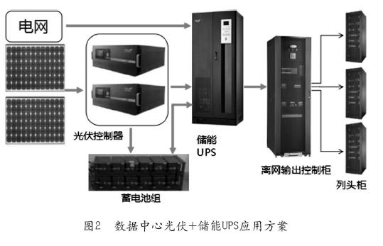 數(shù)據(jù)中心光伏+儲能UPS應(yīng)用方案如圖2所示,它是在現(xiàn)有的儲能UPS方案上增加了光伏,即在白天光照最好的時候,通過光伏控制器給蓄電池進(jìn)行充電。