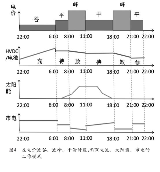 高壓直流型儲能方案如圖3所示,它打造了一個直流微網(wǎng)的方案,通過高壓直流給電池充電,同時給設(shè)備供電。這套方案可以將光伏、風(fēng)機(jī)無縫并到直流系統(tǒng)里面,組成儲能系統(tǒng),但是原有系統(tǒng)卻無需改造。在電價波谷、波峰、平價時段,HVDC/電池、太陽能、市電的工作模式如圖4所示。