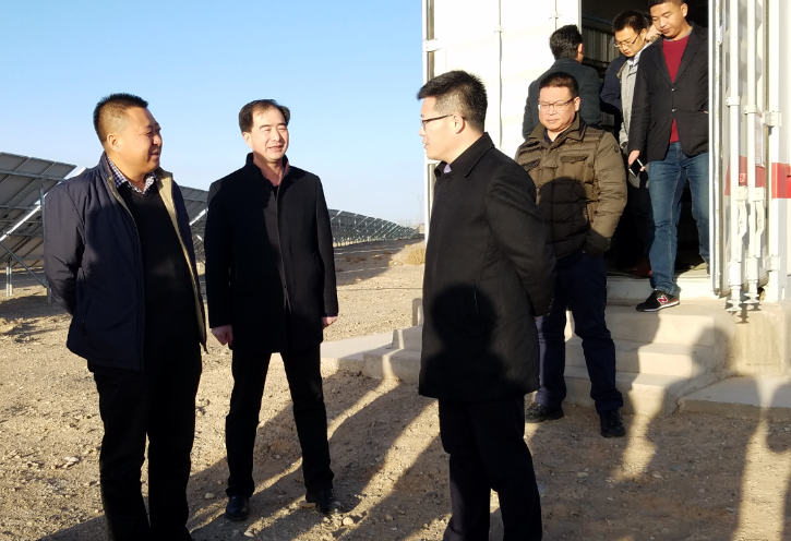 玉門市領(lǐng)導(dǎo)(左一:玉門市政府副市長(zhǎng)仲應(yīng)兵;左二:玉門市能源局局長(zhǎng)魯強(qiáng))與中國化學(xué)與物理電源行業(yè)協(xié)會(huì)儲(chǔ)能應(yīng)用分會(huì)秘書長(zhǎng)劉勇交流科陸風(fēng)光儲(chǔ)電網(wǎng)融合驗(yàn)證示范項(xiàng)目進(jìn)展情況。