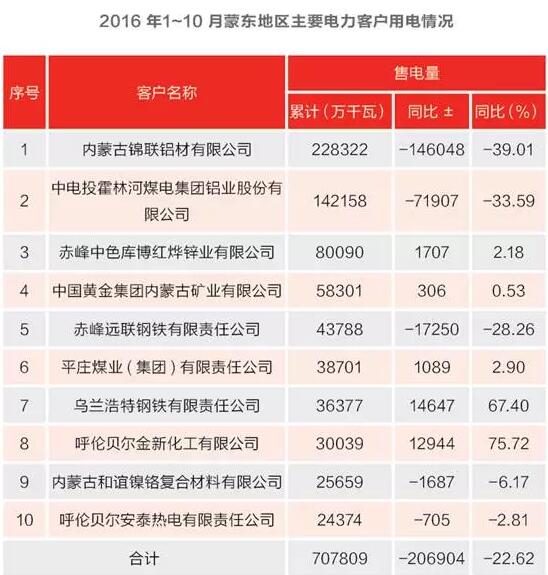 “從11個(gè)月份各主要用戶用電情況來看,區(qū)域內(nèi)主要用電企業(yè)合計(jì)購網(wǎng)電量70.78億千瓦時(shí),同比減少22.62%,用電量總體呈下降趨勢(shì)。其中有色金屬加工、煤炭開采、化工企業(yè)售市場(chǎng)影響,售電量有所增長(zhǎng);主要電解鋁加工企業(yè)如錦聯(lián)鋁材、霍鋁公司購網(wǎng)電量同比減少較多,主要是因?yàn)殇X價(jià)長(zhǎng)期低迷,企業(yè)生產(chǎn)積極性不高?!眲⒖茖W(xué)進(jìn)一步補(bǔ)充。