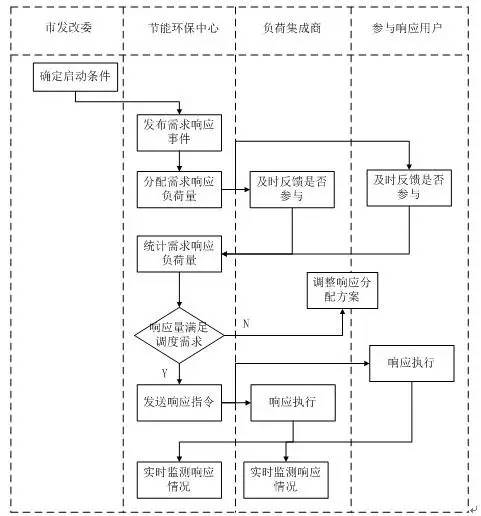 北京市電力需求側(cè)管理綜合服務(wù)平臺設(shè)需求響應(yīng)功能模塊,對各負(fù)荷集成商進行入圍和接入管理,以15分鐘為間隔實時監(jiān)測企業(yè)用電情況,響應(yīng)日前由平臺制定響應(yīng)方案,根據(jù)響應(yīng)承諾量分配應(yīng)執(zhí)行響應(yīng)負(fù)荷量,按提前通知要求向各負(fù)荷集成商下發(fā)方案,并要求反饋預(yù)測執(zhí)行信息。針對可能出現(xiàn)的反饋響應(yīng)負(fù)荷量低于分配量的情況,可根據(jù)實際需求再次調(diào)整分配響應(yīng)量,直到滿足調(diào)用負(fù)荷需求。至響應(yīng)執(zhí)行時間,平臺執(zhí)行響應(yīng)方案,并自動向各負(fù)荷集成商發(fā)出執(zhí)行信息,實時監(jiān)測響應(yīng)執(zhí)行情況。至執(zhí)行時間終止,響應(yīng)方案自動計算響應(yīng)負(fù)荷量和基準(zhǔn)線,并展示需求響應(yīng)執(zhí)行完成情況。針對可能出現(xiàn)的數(shù)據(jù)不完整或數(shù)據(jù)錯誤的情況,平臺可二次重新計算響應(yīng)基準(zhǔn)線和實際響應(yīng)完成量,給各負(fù)荷集成商修正和調(diào)整機會。