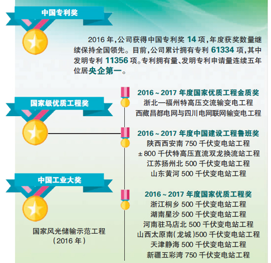 該公司科技創(chuàng)新取得佳績。公司組織申報的青藏電力聯(lián)網(wǎng)工程、電網(wǎng)雷擊防護關(guān)鍵技術(shù)與應(yīng)用、預(yù)防交直流混聯(lián)電網(wǎng)大面積停電的快速防控與故障隔離技術(shù)及應(yīng)用等3項成果榮獲國家科學(xué)技術(shù)進步二等獎,大功率特種電源的多時間尺度精確控制技術(shù)及其系列產(chǎn)品開發(fā)和特大型水輪機控制系統(tǒng)關(guān)鍵技術(shù)、成套裝備與產(chǎn)業(yè)化等2項參與成果獲國家科學(xué)技術(shù)進步二等獎。公司組織申報的12項輸變電工程全部榮獲國家級優(yōu)質(zhì)工程獎,創(chuàng)歷年來公司電網(wǎng)建設(shè)優(yōu)質(zhì)工程創(chuàng)建管理的最好成績。12月11日,國家風(fēng)光儲輸示范工程榮獲我國工業(yè)領(lǐng)域最高獎項——第四屆中國工業(yè)大獎。這是繼1000千伏晉東南—南陽—荊門特高壓交流試驗示范工程和青藏電力聯(lián)網(wǎng)工程后,公司連續(xù)第三次獲此殊榮。公司獲得中國專利獎14項,年度獲獎數(shù)量繼續(xù)保持全國領(lǐng)先。