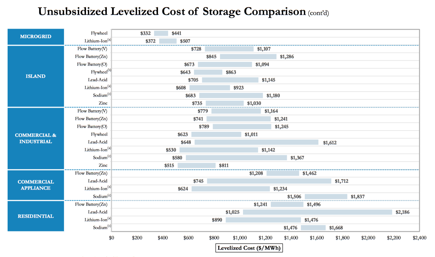 知名投資銀行拉札德(Lazard)于 2016 年 12 月發(fā)布“拉札德能源儲(chǔ)存均化成本 2.0 版”報(bào)告,比較抽蓄水力發(fā)電、壓縮空氣儲(chǔ)能、鋰電池、鉛酸電池、液流電池、鈉電池、鋅電池、飛輪、儲(chǔ)冷儲(chǔ)能,在不同電網(wǎng)應(yīng)用項(xiàng)目下的均化成本,因?yàn)椴煌夹g(shù)特性在不同的應(yīng)用方式下成本不同,其中,主流的鋰電池,與前一年的報(bào)告中的數(shù)據(jù)比較,在各種應(yīng)用上的成本都大為降低。