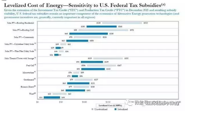如果考慮聯邦稅收優(yōu)惠,那么各類替代能源的全生命周期平準成本下降幅度可達30%: