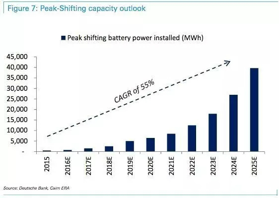 中國儲(chǔ)能網(wǎng)訊:根據(jù)德意志銀行最新發(fā)布的一份研究報(bào)告的分析,全球電池儲(chǔ)能正處于爆發(fā)的關(guān)鍵點(diǎn)。2015年的電池儲(chǔ)能量為70 GWh(7000萬千瓦時(shí)),到2018年將飆升至210GWh(2.1億千瓦時(shí)),而到2025年將進(jìn)一步達(dá)到535GWh(5.35億千瓦時(shí))。