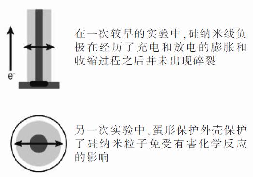 硅納米線和微型蛋形結(jié)構(gòu),前者在吸收和釋放鋰離子時會膨脹和收縮,后者帶有“碳?xì)ぁ?,可保護含有鋰離子的硅顆粒“蛋黃”。