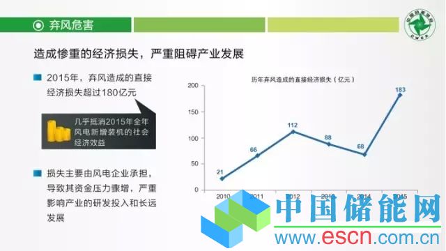 自2010年開始,棄風(fēng)問題愈演愈烈,全國平均棄風(fēng)率長期高于10%。2015年,這一數(shù)據(jù)攀升至15%。特別是入冬后,甘肅、寧夏、黑龍江等省區(qū)的一些風(fēng)電項目的棄風(fēng)率更是高達(dá)60%以上。棄風(fēng)限電帶來的最直接后果就是巨額的經(jīng)濟損失。經(jīng)測算,2010年至2015年,棄風(fēng)電量累計達(dá)到997億千瓦時,直接經(jīng)濟損失超過530億元。僅2015年的棄風(fēng)電量就達(dá)到339億千瓦時,直接經(jīng)濟損失超過180億元。