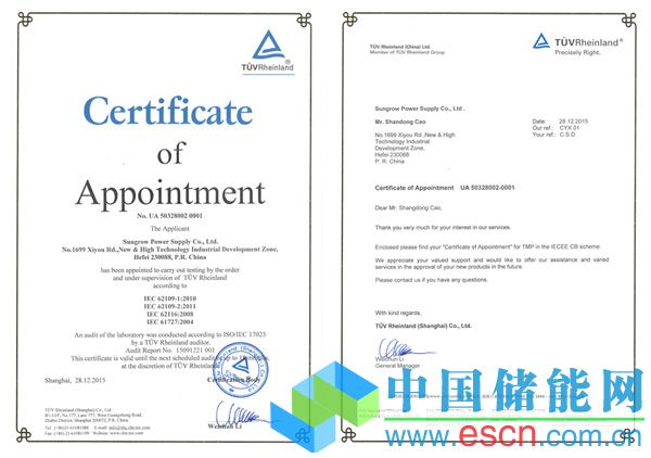 1月14日,陽光電源股份有限公司獲得由TüV萊茵認證公司授予的WMT實驗室資質(zhì),這是TüV萊茵向國內(nèi)逆變器廠家頒發(fā)的首張WMT實驗室資質(zhì)證書,也是陽光電源繼獲得CNAS認可后的又一重大突破,再次證明了陽光電源測試能力方面的領(lǐng)先優(yōu)勢。