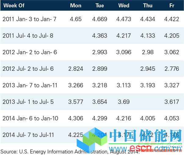 EIA報告顯示天然氣價格在過去幾年總體呈增長態(tài)勢,下表是Henry Hub天然氣現(xiàn)貨在過去四年的價格,其提供了自2011年以來的一月和七月首周的天然氣價格作為參考。
