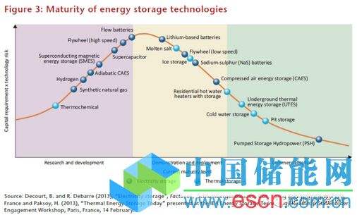 3、各類儲(chǔ)能技術(shù)的技術(shù)成熟度,左邊是研發(fā)階段,中間是示范應(yīng)用階段,右邊是商業(yè)化應(yīng)用階段。