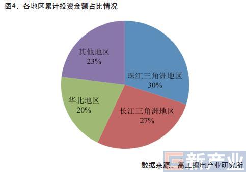 從各省/直轄市投資分布情況來看,廣東省鋰電隔膜生產(chǎn)企業(yè)投資金額最大,達(dá)到10.4億元,主要來自于深圳星源材質(zhì)、佛山金輝和佛山東航等;河南省以6.7億元排名其次;江蘇省則以4.9億元排名第三(如圖3)。從地域劃分的角度來看,鋰電隔膜投資集中在長江三角洲、珠江三角洲和華北地區(qū)。其中,來自長江三角洲的隔膜生產(chǎn)廠商投資金額達(dá)到11.2億元,占比30%;以廣東省為代表的珠江三角洲企業(yè)投資金額為10.4億元,占比27%;華北地區(qū)投資金額為7.6億元,占比20%(如圖4)。