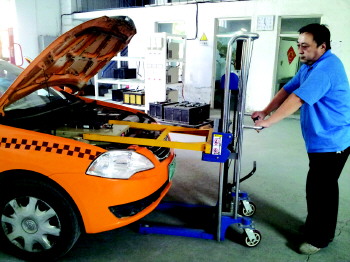 目前,電動出租車尚不能達到隨時充電的境界,因此只能最大限度地提高更換電池和充電的速度。為此,他們對電動出租車實行兩班制經(jīng)營,并按照1:2的比例,每輛電動出租車都配了2組電池,一組充滿電的電池代替耗沒電的電池組在道路上工作,而被替換下的電池則在固定的充電處,由專門人員負責充電并進行維護、保養(yǎng)。