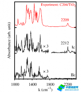 他們進(jìn)一步研究了不含金屬的純有機(jī)分子在TiO2界面上的原子結(jié)構(gòu)對形成的有機(jī)染料太陽能電池效率的影響。這類分子一般采納Donor-π-Acceptor的結(jié)構(gòu),大多通過氰基丙烯(cyanoacrylic) 基團(tuán)與表面結(jié)合。雖然這一類分子得到極為廣泛的應(yīng)用,但其吸附結(jié)構(gòu)并不清楚。此前人們普遍認(rèn)為這一類有機(jī)染料與傳統(tǒng)釕復(fù)合物染料類似,只通過羧基吸附在TiO2表面?;诘谝恍栽矸肿觿恿W(xué)和含時密度泛函理論計算,焦揚(yáng)等與瑞士聯(lián)邦理工Michael Graetzel教授合作研究了含氰基丙烯基團(tuán)的有機(jī)分子在銳鈦礦TiO2(101)表面的吸附和電子動力學(xué)(圖1)。通過對動力學(xué)模擬得到的振動譜的詳細(xì)分析和與實(shí)驗(yàn)得到的紅外吸收譜的比較(圖2),他們發(fā)現(xiàn)氰基和羧基共同參與表面吸附,該吸附構(gòu)型非常有利于太陽能源轉(zhuǎn)化。