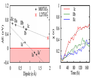中國科學(xué)院物理研究所/北京凝聚態(tài)物理國家實(shí)驗(yàn)室(籌)表面實(shí)驗(yàn)室SF10組博士生焦揚(yáng)、張帆、丁子敬和孟勝研究員等最近對基于有機(jī)分子的太陽能電池機(jī)理做了細(xì)致的理論和實(shí)驗(yàn)研究。使用包含激發(fā)態(tài)信息的含時密度泛函理論模擬,他們發(fā)現(xiàn)在TiO2界面上分子的能級受界面化學(xué)鍵的振動所調(diào)制,從而直接影響激發(fā)態(tài)電子向半導(dǎo)體注入的動力學(xué)過程和效率【Phys. Chem. Chem. Phys. 13, 13196(2011)】。