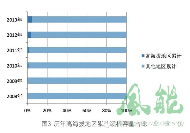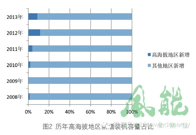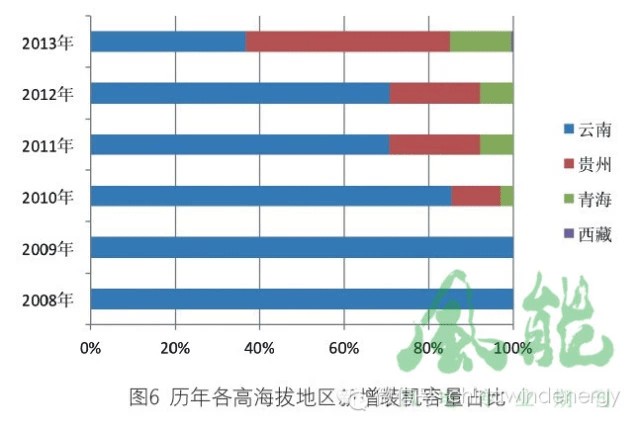 在占比方面,雖然2013年高海拔地區(qū)的新增裝機容量占比有所下降,但在累計裝機容量占比趨勢上始終表現(xiàn)出上升態(tài)勢。出現(xiàn)新增裝機容量占比略有下降而累計裝機容量占比上升的情況,從側面說明中國高海拔地區(qū)的風電裝機起步較晚,但其發(fā)展跑贏了總體裝機趨勢。