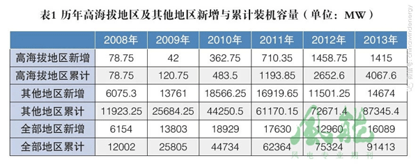 據(jù)中國可再生能源學會風能專業(yè)委員會的數(shù)據(jù)顯示,中國從2008年開始在高海拔地區(qū)有風電裝機,到2013年底累計裝機容量達到4067.6MW。在此6年間,高海拔地區(qū)新增裝機量總體呈現(xiàn)以上升為主,期間略有波動的趨勢。其中,除2009年和2013年與前一年的新增裝機量相比略有下降外,2008年、2010年、2011年和2012年高海拔地區(qū)的新增裝機容量都比前一年有所上升。2013年,中國高海拔地區(qū)新增裝機容量為1415MW,占全部新增裝機容量的8.79%,相比2012年的1458.75MW及11.26%的占比,各數(shù)據(jù)均有所下降。與2012年相比,新增裝機容量在2013年下降的比較小,而占比卻下降的比較大,這從側面印證了2012年高海拔以外地區(qū)的新增裝機量曾出現(xiàn)較大的下降。雖然2012年以前新增裝機容量上升速度較快,但由于此前的裝機基數(shù)并不大,表現(xiàn)在累計裝機增長上并不明顯,與之相反的是,2011年以后高海拔地區(qū)的新增裝機量達到了一定的量級,雖然在2013年有所下降,但累計裝機上升的卻更為明顯。