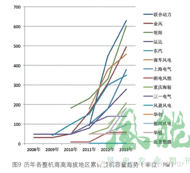 在高海拔地區(qū)的新增裝機容量方面,2013年明陽的該項數(shù)據(jù)最為惹眼,為272MW。第二位的上海電氣為200MW。第三位的金風為187.5MW,第四位的聯(lián)合動力為180MW,第五位的重慶海裝為128MW。其中聯(lián)合動力是2012年在高海拔地區(qū)新增裝機最高的整機商,達到了357MW,這也是截至2013年底單個整機商在高海拔地區(qū)一年時間內的最大裝機量。由圖8可以看出,各整機商在高海拔地區(qū)歷年的新增裝機量變化較大,使名次變化也較為頻繁,說明在高海拔地區(qū)的風電裝機本身量不是太大,從而受項目影響比較大。
