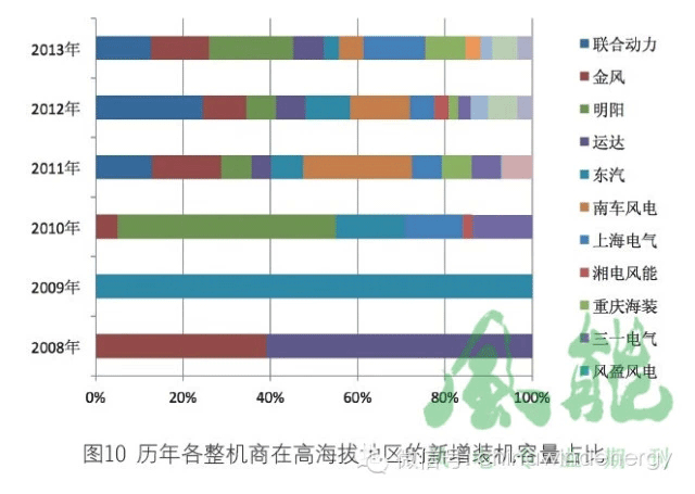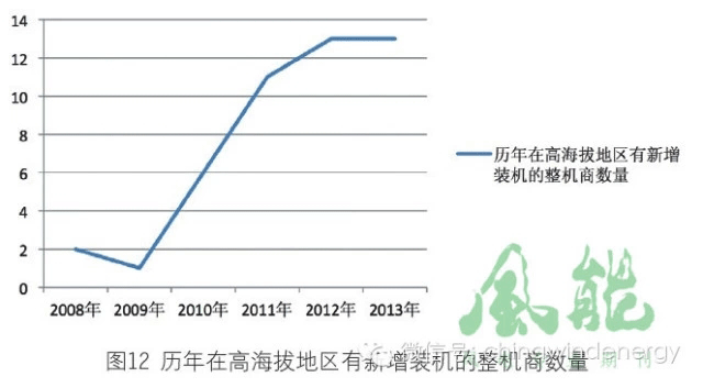 歷年在高海拔地區(qū)有新增裝機的整機商數(shù)量,除2009年比2008年少了1家外,整體上處于不斷增加的趨勢。整機商數(shù)量最高時的2012年和2013年均為13家。2013年在高海拔地區(qū)有裝機的整機商數(shù)量是當年在中國有風電裝機的整機商數(shù)量的43.33%。