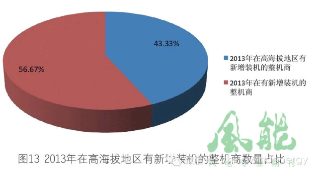 由圖10可以看出,各整機商在高海拔地區(qū)的新增裝機占比呈現(xiàn)細分化趨勢,一家獨大的局面逐步減弱,市場被越來越多的整機商所分割。2012年在高海拔地區(qū)新增裝機量占比最高的整機商是聯(lián)合動力,達到了24.47%;2013年在高海拔地區(qū)新增裝機量占比最高的整機商是明陽,達到了19.22%。