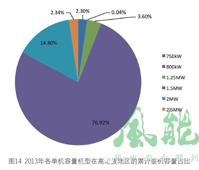 2013年各單機容量的風電機組中,在高海拔地區(qū)累計裝機容量占比最高的是1.5MW型機組,達76.92%。其次是2MW機組,為14.8%。2.5MW和750kW機組分別占比在2.34%和2.3%左右。占比最小的是800kW型機組,是由風盈風電在2012年貴州安裝的2臺。