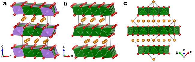圖1 計算模型:(a) P2-Na[Li0.33Ti0.67]O2,(b) P2-NaTiO2,(c) O3-NaTiO2。橙色、紫色、綠色和紅色分別代表鈉、鋰、鈦和氧