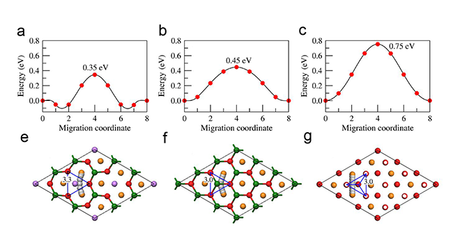 圖2 Na+離子擴散活化能和擴散路徑:(a, e) P2-Na[Li0.33Ti0.67]O2,(b, f) P2-NaTiO2,(c, g) O3-NaTiO2